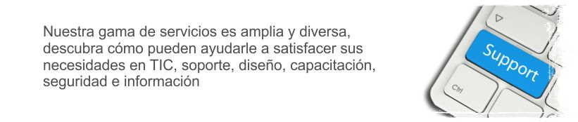 Prestamos multiples sevicios en Tecnologías de la Información y Comunicaciones, Informática, Redes, Bases de Datos, Seguridad, Diseño Web, Desarrollo de Aplicaciones a su medida y en el lenguaje de programación que necesite, instrucción y capacitación de personal en áreas de las tecnologías e informática, Montaje, mantenimiento, actualización y reparación de equipos de cómputo, ofimática y periféricos